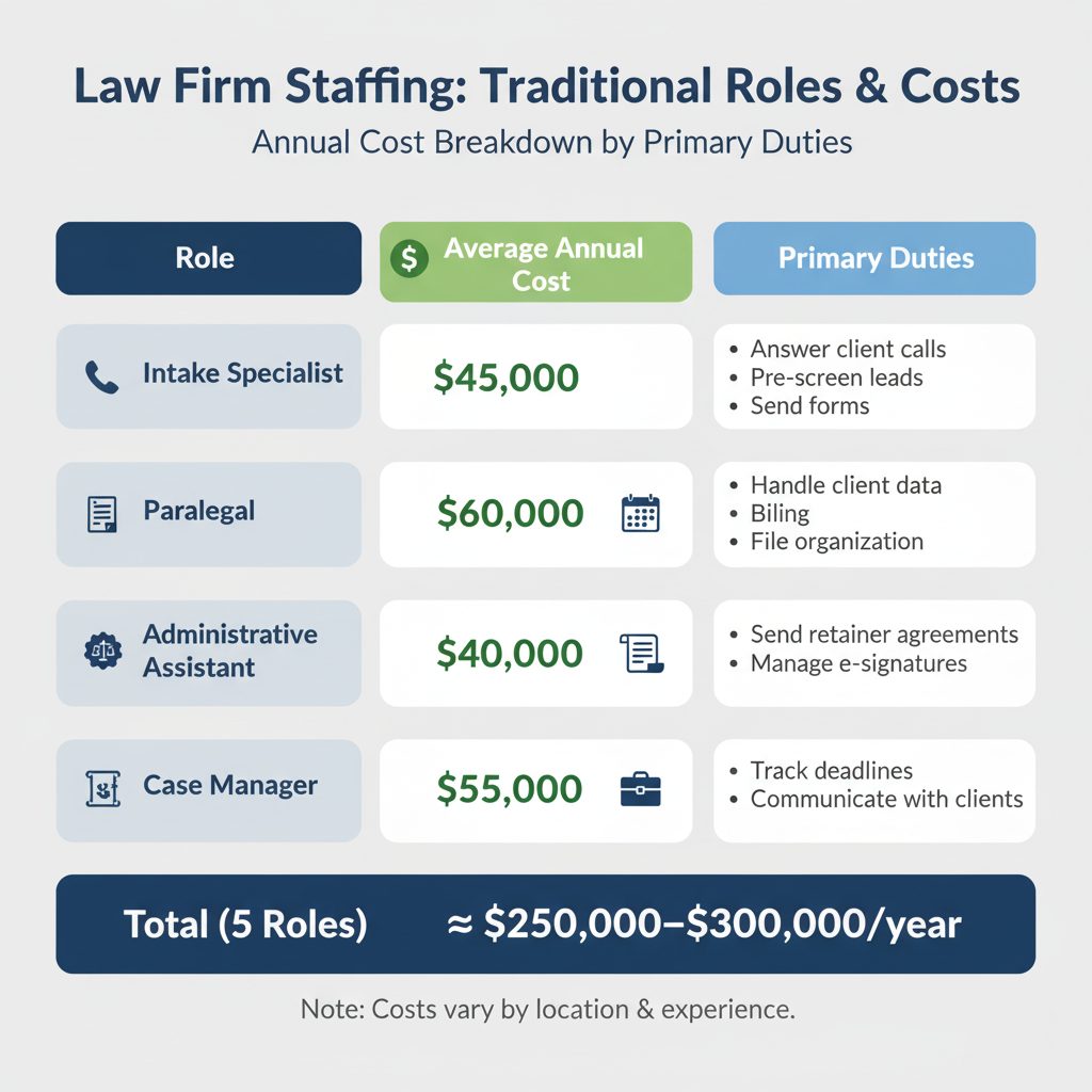 For most firms, the math doesn’t add up. A mid-sized U.S. immigration firm can easily spend $250K–$350K annually on non-attorney staff — from intake specialists and paralegals to administrators and contract managers.