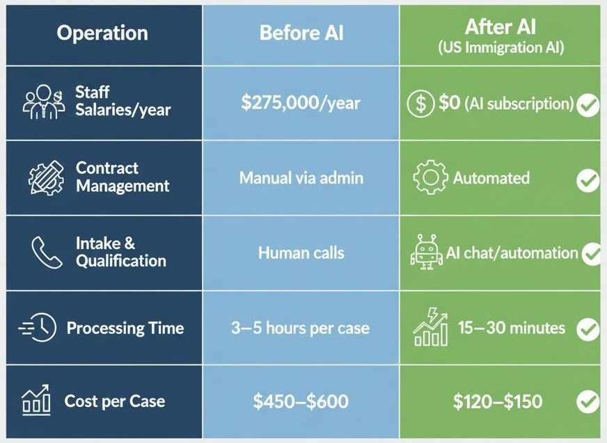 By automating repetitive functions — intake, evaluation, contract management, and case tracking — AI doesn’t just reduce costs; it transforms how immigration firms operate.