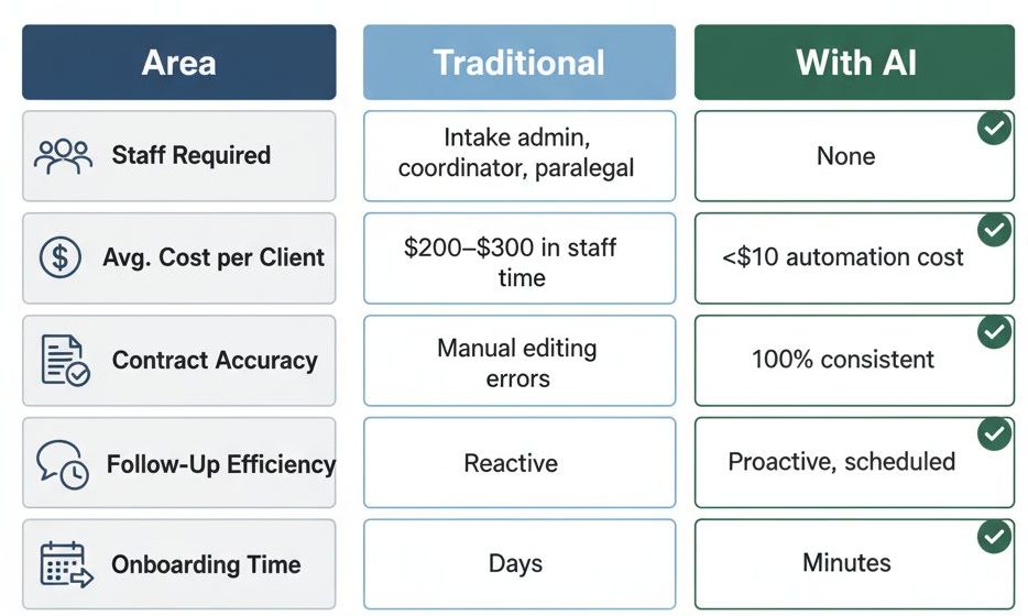 One attorney with AI can now onboard 50–100 new clients per month — something that used to require a full operations team.