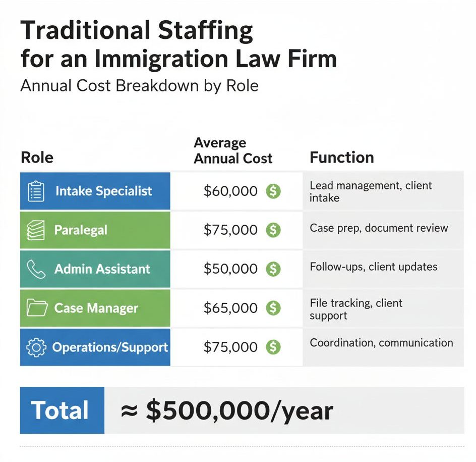 With US Immigration AI, these roles are replaced by one system — costing about 10% of that.